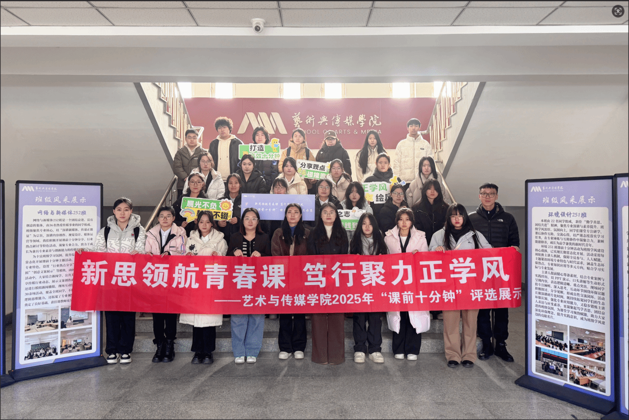 为进一步夯实“五位一体”学风建设模式,引导学院全体学生明确学习目标,端正学习态度,增强学习动力,努力营造“刻苦钻研,勤学力行”的学风,11月27日,艺术与传媒学院在思成楼517室举办“新思领航青春课,笃行聚力正学风”——2025年“课前十分钟”评选展示活动。学院团委副书记、学生工作办公室副主任刘红阳,辅导员苗松旸、张延渠、张雪煜及各专业学生代表参加活动并担任评委。